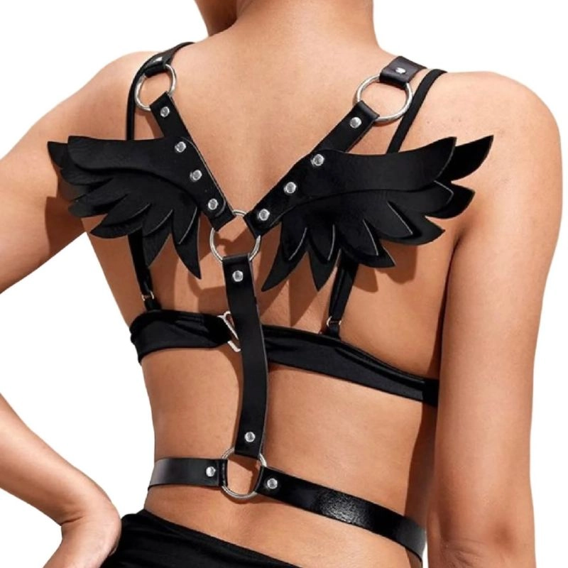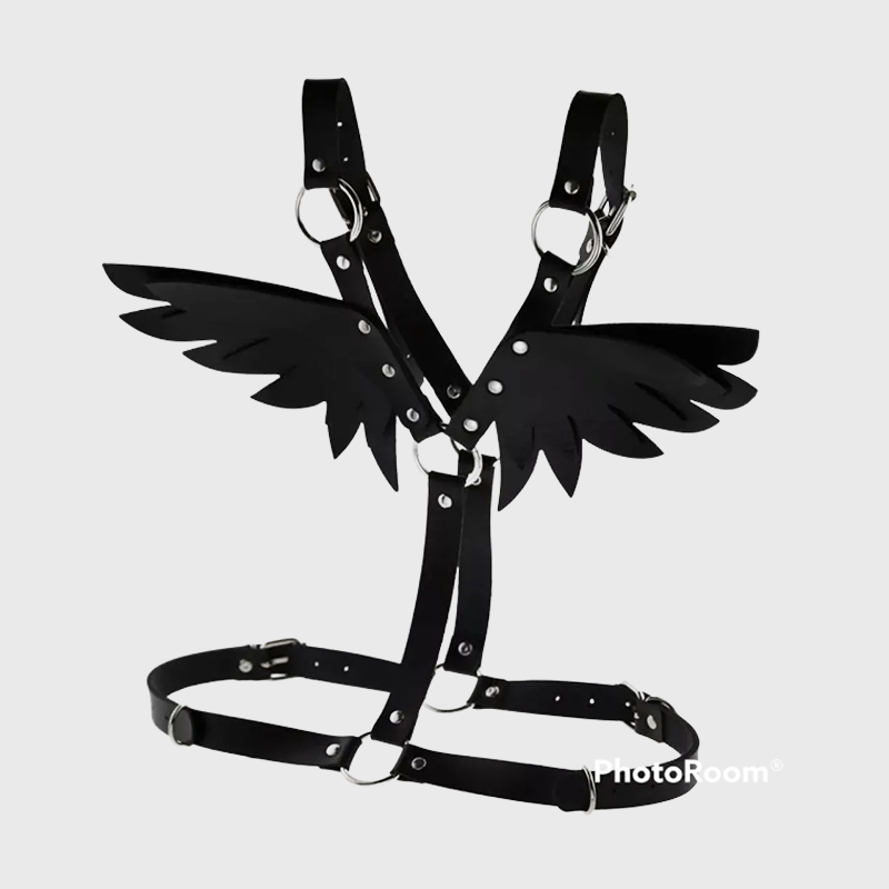 Eleva el estilo y la seducción con este impactante arnés de diseño alado, perfecto para complementar lencería, outfits fetichistas o como accesorio de moda alternativa.